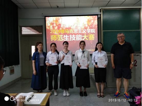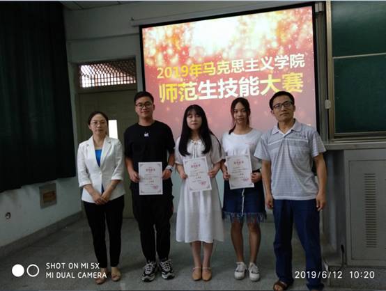 (通讯员:周儒峰)2019年6月12日上午8点,马克思主义学院师范生教学技能竞赛决赛在东校区13教A302隆重举行。我院党总支书记吴志勇老师、副院长黄晓云老师、政治系主任贾廷秀老师、周涛老师、卢军老师、汤波兰老师以及思想政治学科教学论教师万敏应邀担任本次比赛的评委。