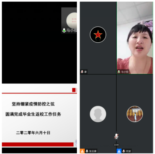 会上,马小佼副书记首先传达了学校毕业生返校工作动员会的相关精神,重点解读了长江大学2020届毕业生返校工作实施方案,并就马克思主义学院毕业生返校办理离校手续的组织分工、时间安排、办事流程进行了逐一讲解。辅导员张云雾老师则从学生返校前、返校中、返校后的具体准备工作和注意事项进行了宣讲,提醒返校学生加强安全防范,遵守校纪校规,高效办理离校手续。毕业生们还就毕业生离校手续清单办理流程、在校期间饮食、行李托运等具体事项进行了咨询,学院老师进行了线上解答。