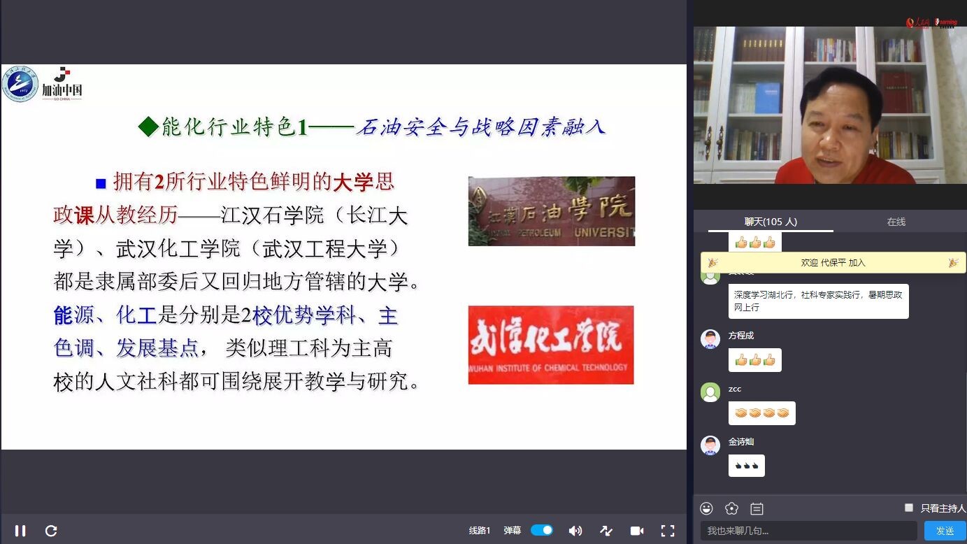 (通讯员 龙晓华)2020年7月4日晚,由长江大学马克思主义学院主办 ,人民网公开课协办,华中科技大学马克思主义学院、湖北经济学院马克思主义学院、武汉工程大学马克思主义学院、湖北科技学院马克思主义学院、黄岭峻工作室及文华在线教育六家单位承办的湖北省第二届“新时代高校思政金课建设”研讨与交流周系列活动之湖北高校“中国系列”思政选修课第四次专题讲座以人民网公开课的方式成功举办。本次讲座的主讲人为武汉工程大学马克思主义学院党委书记、国家精品视频公开课《谁来给中国“加油”——中国石油安全的困境与出路》主讲人、“加油中国”课程负责人舒先林教授,讲座主题为“如何将行业特色融入思政课?——以武汉工程大学‘加油中国’为例”。