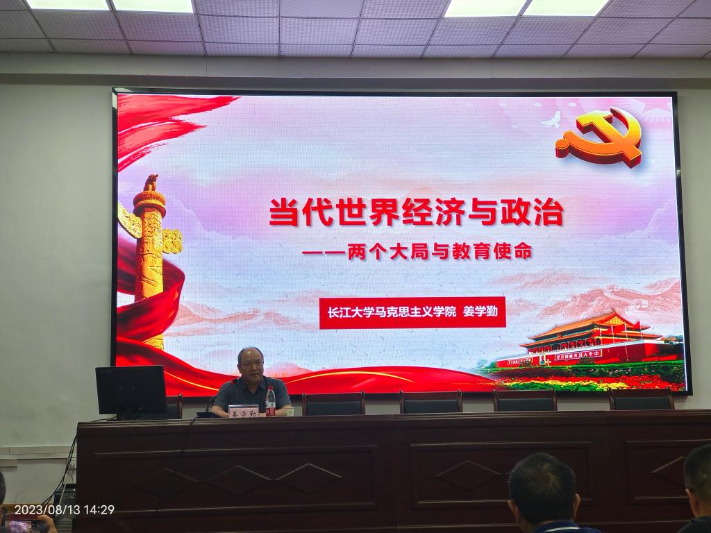 授课专家为长江大学马克思主义学院姜学勤院长。姜院长以当代世界经济与政治为题,从百年未有十大变局、中华民族伟大复兴的战略全局、教育使命等几个方面,给我们做了一场精彩的报告,整个报告放眼世界统观全局,深入浅出,结合了教育实践,为我们解析中国与世界经济的关系,包括面临当下严峻的国际形势,中国实施的正确的发展战略和方针政策。整个报告有理论深度,有思想深度,有针对性、实效性,对我们全面而正确的践行教育使命,具有极强的指导意义。