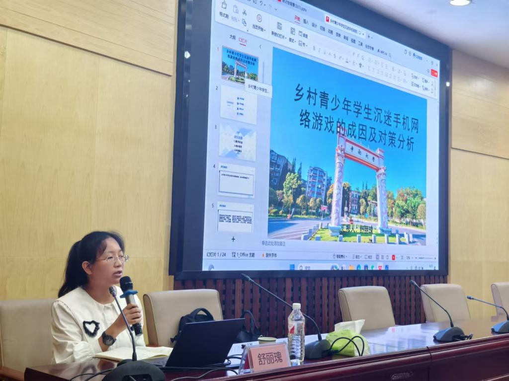 随后,中南大学人文学院讲师,管理学博士舒丽瑰为学员作了题为《乡村青少年学生沉迷手机网络游戏的成因及对策分析》的专题讲座。舒丽瑰博士介绍了乡村青少年学生沉迷手机网络游戏的研究背景与研究缘起,并就乡村青少年沉迷手机网络游戏的原因、对策等问题与学员们进行了面对面的探讨。