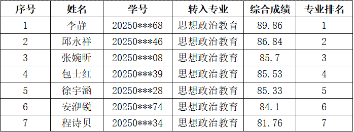 根据《长江大学普通本科生专业分流与转专业管理办法(试行)》(长大校发[2019]260号)、本科生院《关于开展2025级普通本科生春季学期转专业工作的通知》和《马克思主义学院2025级本科生春季学期平级转专业考核工作方案》,我院对2025级春季学期转专业符合面试条件的学生进行了考核,并按综合成绩进行排名。经学院党政联席会讨论通过,现将拟接受名单予以公示。