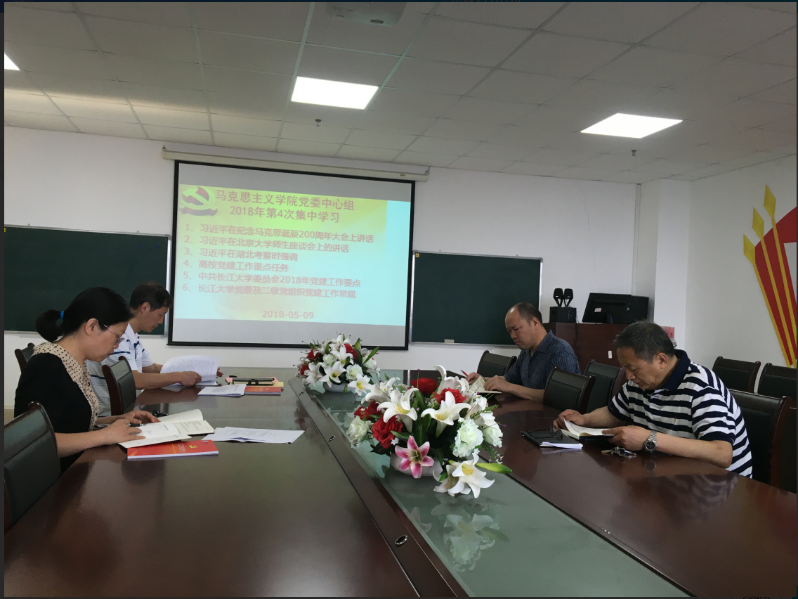 马克思主义学院于2018 年5月9日在文科楼1104室举行了党委理论学习中心组第四次集中学习,会议由党总支书记吴智勇主持。