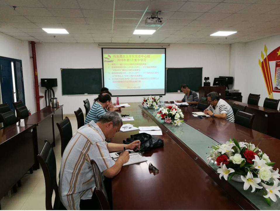 马克思主义学院于2018 年6月8日在文科楼1104室举行了党委理论学习中心组第五次集中学习,学院总支委员、支部书记和系部主任参加了学习会,会议由党总支书记吴智勇主持。
