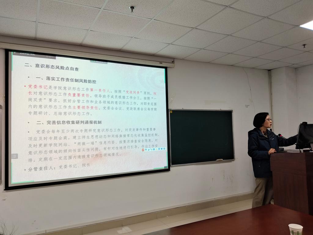 会上,刘小燕书记领学了中共中央办公厅于2020年颁发的《党委(党组)意识形态工作责任制实施办法》,她从意识形态工作的重要性、原则、责任主体、具体内容、管理体系建设等五个方面进行了解读,还结合近期校内外涉及意识形态工作的典型案例分析开展了意识形态风险点自查,讲解了学院意识形态工作重点领域风险防控办法,并部署了2023年上半年党建思政、意识形态、党风廉政重点工作。