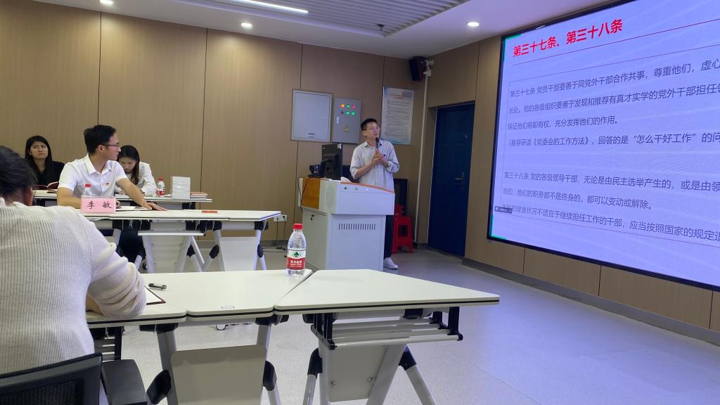 首先,支委翟高带领大家重温了入党誓词,领学了《中国共产党章程》第六章。随后杨锦钰同志讲授了题为“中国共产党为什么行”的微党课,杨申同志领学了党的二十大报告、杨鑫同志分享了学习《习近平著作选读》(第一卷)的心得体会。毕业生吴银霞将习近平总书记给参与“澳门科学一号”卫星研制的澳门科技大学师生代表的回信进行了深情解读,张晓燕等同志则领学了“浦江经验”、浙江“千万工程”经验案例。