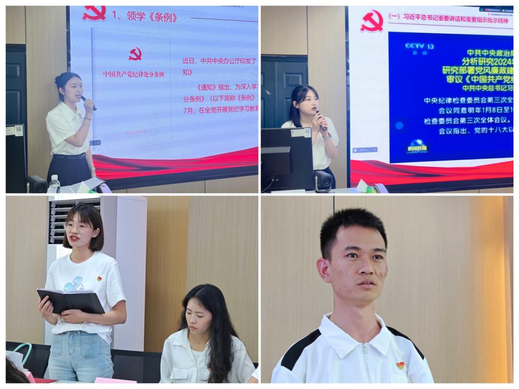 在第二篇章“反思自我 明纪于心”中,田雨萱结合案例,带领与会党员一同学习新修订的《中国共产党纪律处分条例》(以下简称“条例”)第8—11章及附则内容,重点解读违反党的群众纪律和工作纪律等相关处分规定。何先澳、杨锦钰、黎娟、燕军4名学生党员,紧扣“六项纪律”,结合自身实际,畅谈学习《条例》的心得体会。