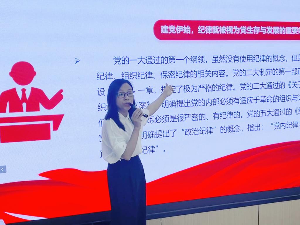 “我志愿加入中国共产党,拥护党的纲领,遵守党的章程…”全体与会党员重温入党誓词过后,活动进入第一篇章“学习党史 知纪于心”。支部书记汤慧珍以“党史上的纪律教育”为题讲授微党课,通过回顾1920年—2024年党的纪律建设历程,结合典型案例并从全局高度阐释了不同历史时期党纪学习教育的意义、内容和特点,引导同学们以史为鉴,更好地弘扬纪律强党优良传统,传承严明纪律的红色基因,争做学纪、知纪、明纪、守纪的表率。支部成员梁芷璐带来的“周恩来的十条家规”红色党纪故事分享,声情并茂,生动感人,引发大家强烈共鸣。马子灏等六位支部党员齐声合唱长征路上人民军队的“铁律之歌”—三大纪律八项注意,烘托出浓厚的党纪学习教育氛围。