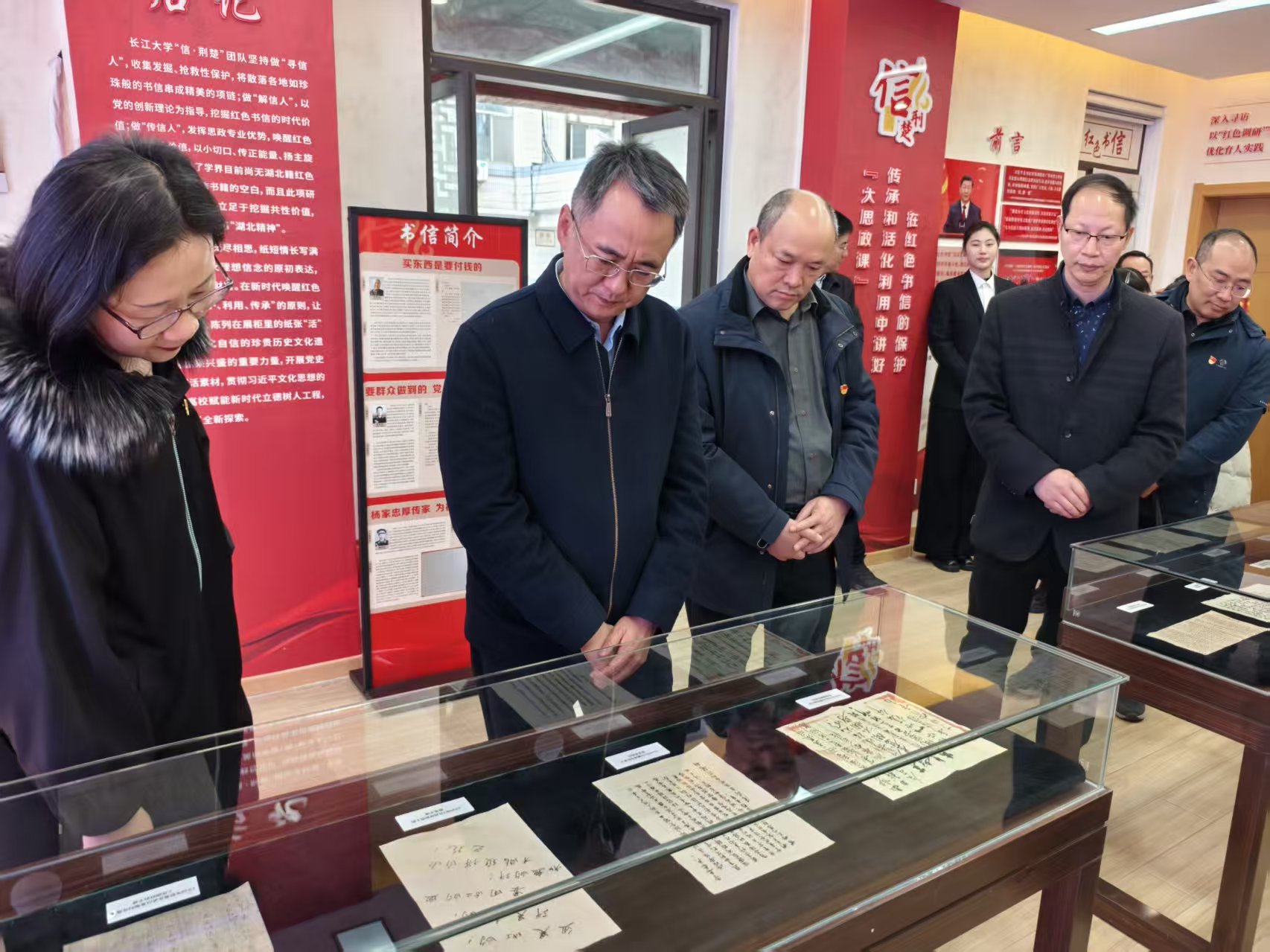 当天上午,学校党委书记王建平走进长江大学“信·荆楚”思政育人展览馆,实地调研“大思政课”建设工作,并就如何进一步用好红色书信资源、深化思政育人实效进行现场指导。“信·荆楚”团队学生负责人袁田以“在红色书信的保护传承和活化利用中讲好铸魂育人‘大思政课’”为主题,介绍了展馆建设情况,详细汇报了团队近五年来围绕“寻信、解信、传信”所开展的育人实践工作。支部党员吴宇洁以“从红色书信中读懂树立和践行正确政绩观的三重答案”为题讲授微党课,她以红色书信为切入口,从“政绩为谁而树、树什么样的政绩、靠什么树政绩”三个维度,引导在场师生从中探寻新时代政绩观的精神密码。