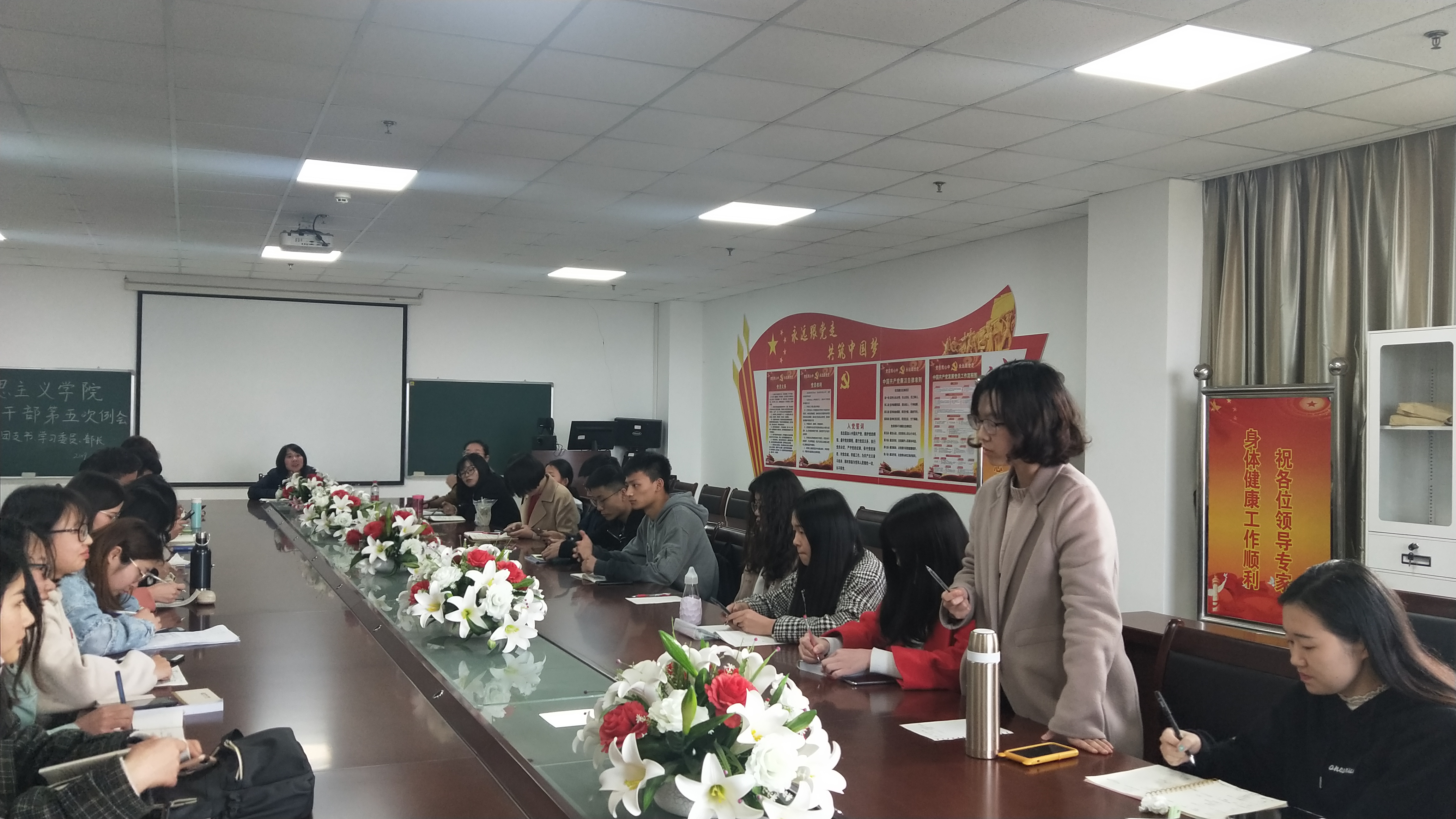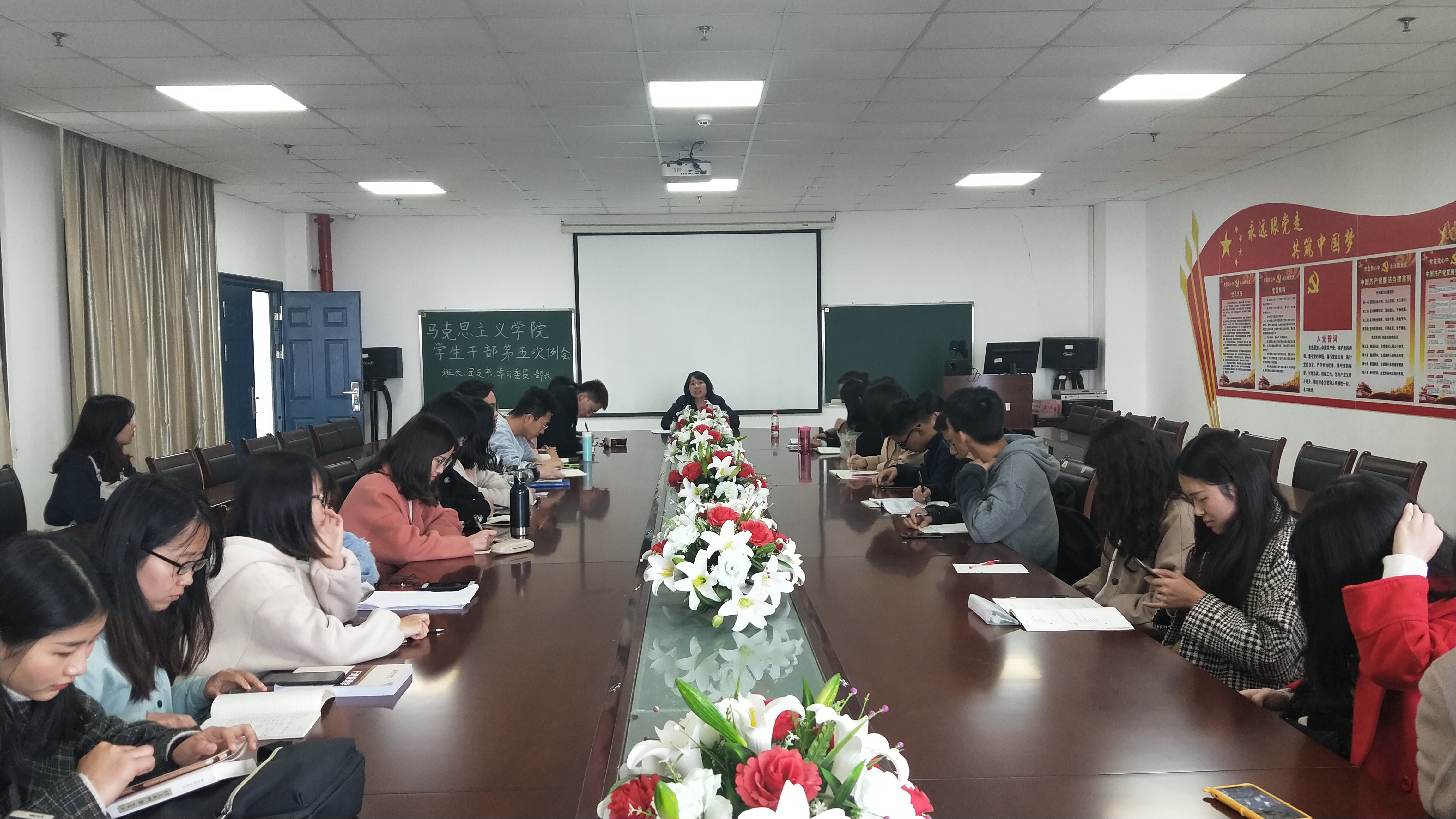 (通讯员:张也) 3月25日下午四点,马克思主义学院辅导员张云雾老师在文科大楼1104室主持召开了第五次学生干部例会暨学风建设动员大会,出席本次会议的人员有马克思主义学院兼职辅导员饶静老师,全院班级的班长团支书学习委员,以及马克思主义学院学生会主席团和各部门部长。张云雾老师就近期出现的问题做了强调并进行了工作安排。