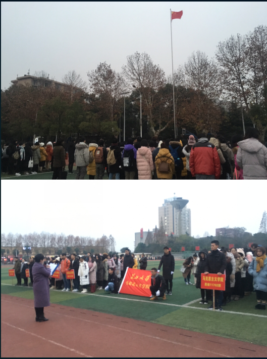 为对广大师生进行爱国主义、集体主义教育,提升民族精神、提高民族凝聚力,将践行社会主义核心价值观落小落细落实,马克思主义学院于12月10日早上7点在东校区田径场举行了升国旗仪式。学院分党委书记吴智勇、副书记马小佼,辅导员张云雾、兼职辅导员饶静以及全院本科生、在校研究生参加了本次升旗仪式,仪式由院学生会主席龚道荣主持。