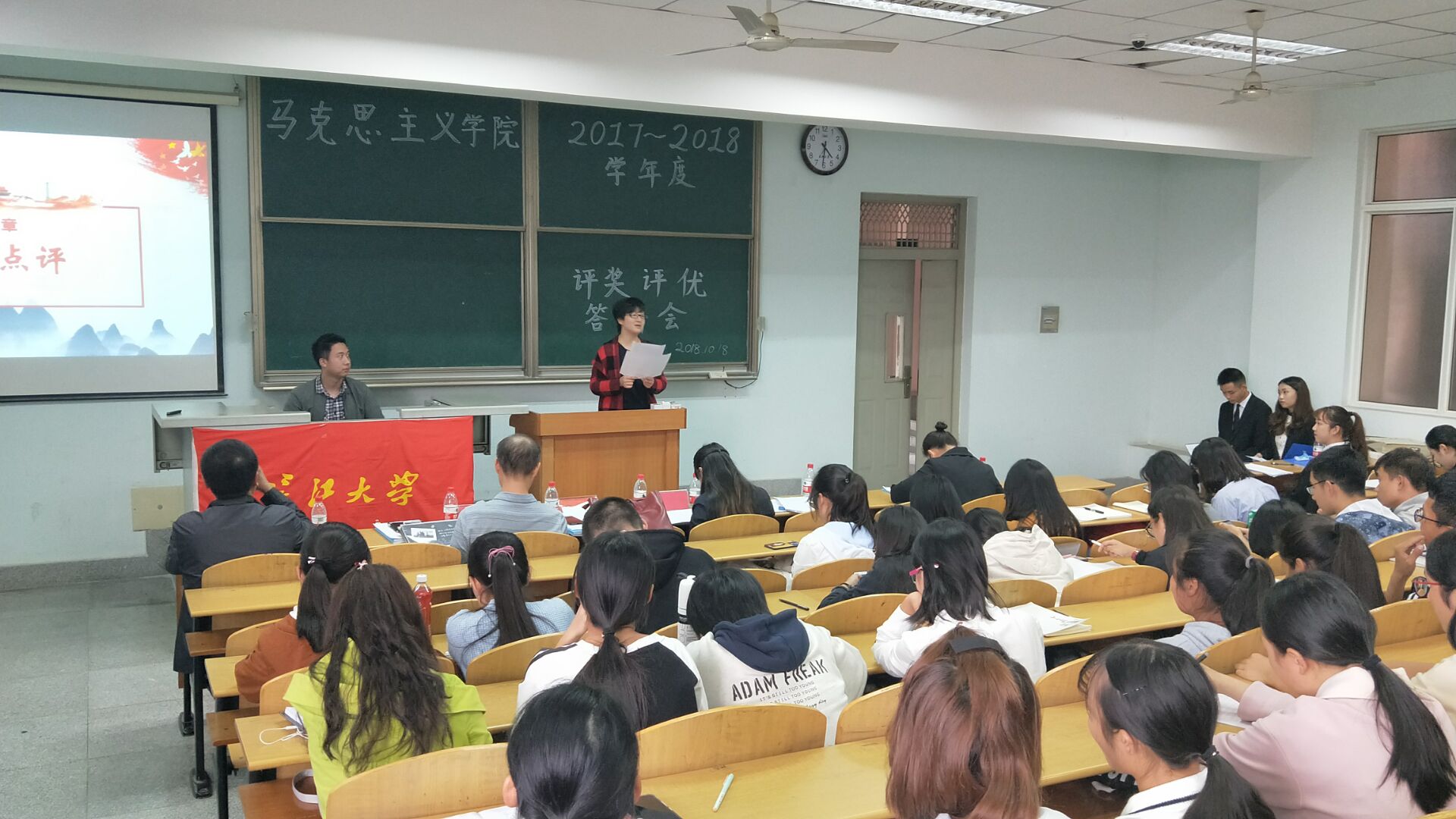 三点大会准时开始,首先进行的是优秀班集体答辩,其中各个优秀班级的学生代表在各自的PPT中都展示了本班的班级风采,并介绍了本班的优秀学生代表、学习情况、公益服务情况、文体娱活动情况、班级集体以及个人的获奖情况还有本班的特色工作。充分提现出马克思主义学院班集体的立体风采。随后进行的是三好学生答辩,各位优秀的学生以PPT形式向我们展示了自己的学习情况、获奖情况、在班级学院担任学生干部的情况、参与的公益服务及其社会实践活动情况。接下来一个环节是优秀班干部答辩,各位优秀班干部详细地介绍了自己的学习工作和参加活动的情况,介绍完毕后,由老师评委进行打分。