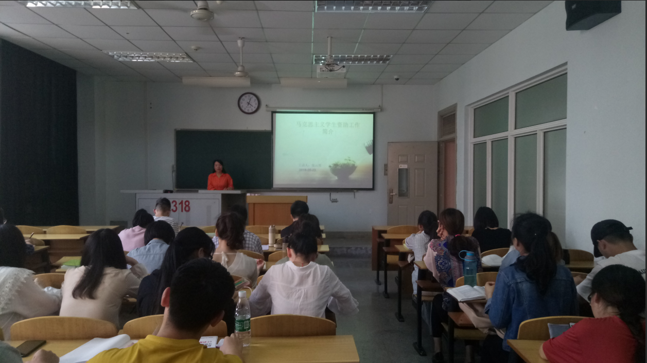 在会上,张老师首先介绍了高校家庭经济困难学生的资助政策和工作体系,并强调学校学生资助工作的三个重点是助学贷款、奖助学金评审和诚信教育。并对学生资助工作日常流程和分月计划做了详细的介绍,重点宣传了学校的资助育人理念“千方百计帮助学生筹钱”、“教育学生千方百计还钱”、“千方百计维护学生声誉”,还对助学贷款的还款方式进行了系统的培训。最后,张老师介绍到,马克思主义学院资助工作亮点在于奖助学金申请答辩制,考察学生的综合表现。