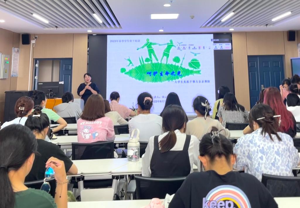 本次讲座的主题是“呵护生命之光——大学生危机干预与自杀预防”。讲座伊始,张老师以9月10日既是教师节,也是国际预防自杀日为引,将心理危机干预知识小测试作为热身互动来启发同学们的思考,随后张老师从心理危机——大风起兮、自杀——摇摇欲灭的生命之光、干预和预防——呵护生命之光三个主要方面进行了详细讲解。张老师主要就什么是心理危机、心理危机的常见类型及心理危机的特征与反应三个方面展开讲述,细致地向各位学生骨干们说明了心理危机是怎么来的、又要如何去应对的问题。随后,张老师进行了互动式的讲解,先抛出问题,让各位学生骨干在思考中明白大家对待生命的态度应是尊重、爱惜与敬畏。然后从自杀的主要原因、自杀前的心理过程、自杀前的征兆以及自杀的预测指标、时间特征等几方面入手,让大家对于自杀这种极端行为有了更加深入的了解。而在危机干预方面,张老师主要从危机背后的转机、学生干部的职责以及面对危机该怎么办几方面展开阐释。她以危机自救与他人救助两个角度为落脚点,着重强调了在面对危机时,各位学生骨干要及时报告、做好监护,共同挽救每一个宝贵的生命。