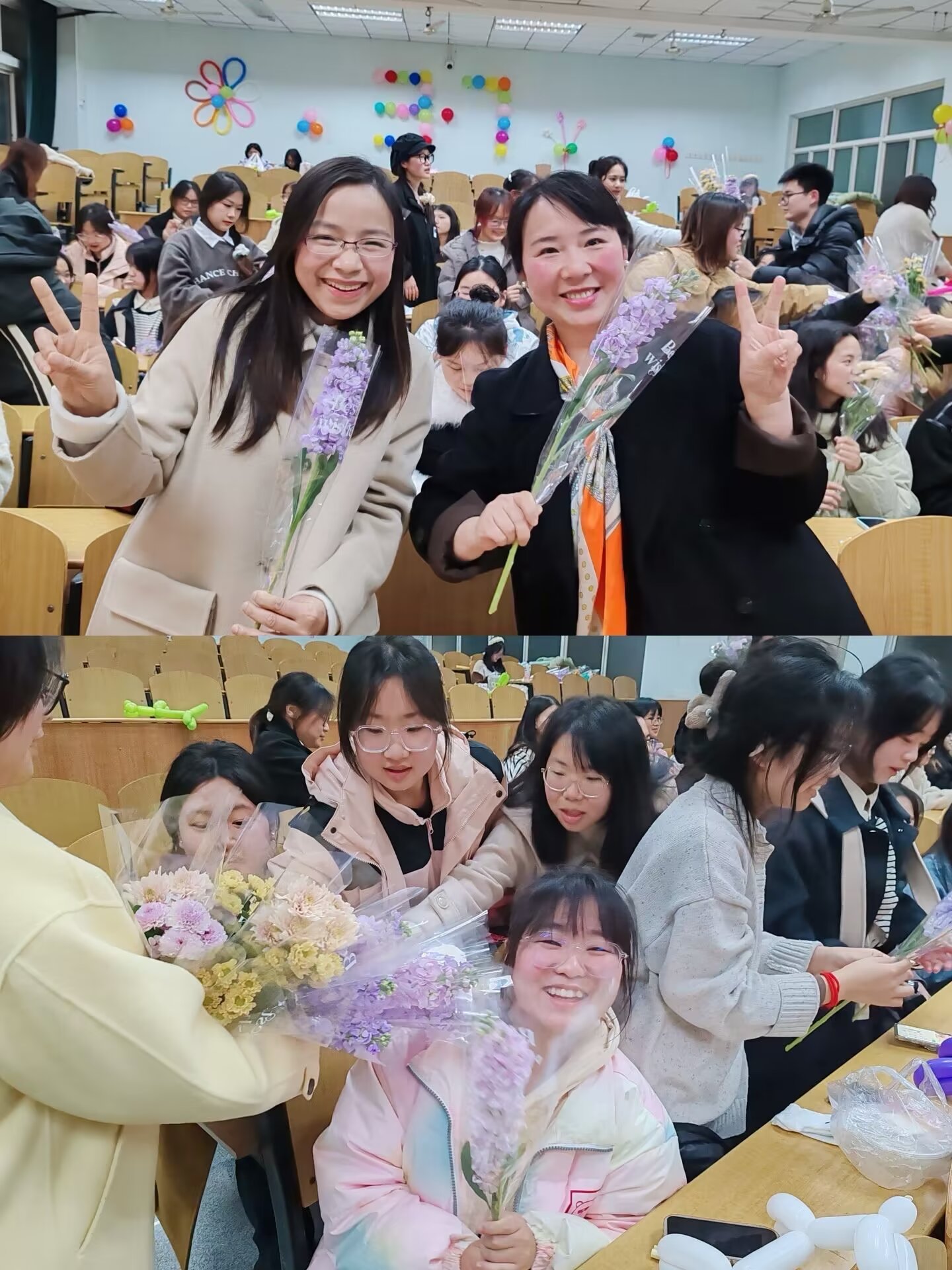 “三月春风拂花开,桃李年华正还是。愿你笑靥如花,眼中总有光芒!”伴随着主持人的祝福,学院为在场每一位女生送上了鲜花和精美的小礼品。同学们还互相交换了写有温暖祝福的明信片。“这次活动让我学到了很多关于女性的知识,也充分感受到了属于马院的爱和温暖”,活动结束后,不少同学发出感慨。