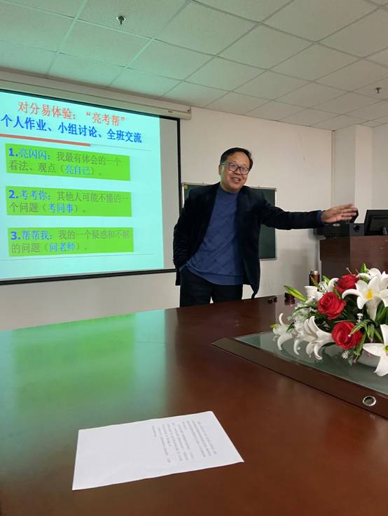 “所谓对分课堂,核心理念是权责对分,通过师生在教学过程中分享权力、共担责任,促进学生的主动学习,培养其核心素养和创新能力,实现全面、健康的个性发展。”王教授充满激情地向师生们介绍教学改革的新理念,强调在新时代,要充分发挥学生的主体作用,一定要让学生参与学习;思政课教学要与信息技术深度融合,要辩证地看到手机的作用,让手机从影响课堂教学的娱乐设备,转变为老师教学和学习学习的利器,要充分利用移动互联技术实现课堂教学的全员互动,实时互动,而不要“顽强”地拒绝新生事物。
