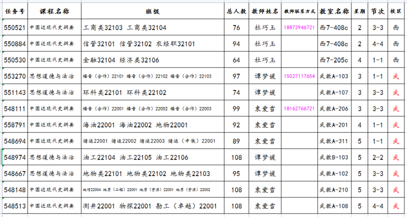 认证小组成员对我院每位申请认证的青年教师进行听课,听课评议统一按《长江大学教师课堂教学质量评估表》进行,不得漏评。对本组每位青年教师听课不少于1小节课(对武汉校区的两位老师可进行线上听课,专家提前联系老师获取课堂邀请码),如果参加认证的青年教师讲授的课程不止一门,认证小组专家可随机听课,不限于只听其中某一门课程。我院参加本次青年教师教学水平认证的人员开课信息如下: