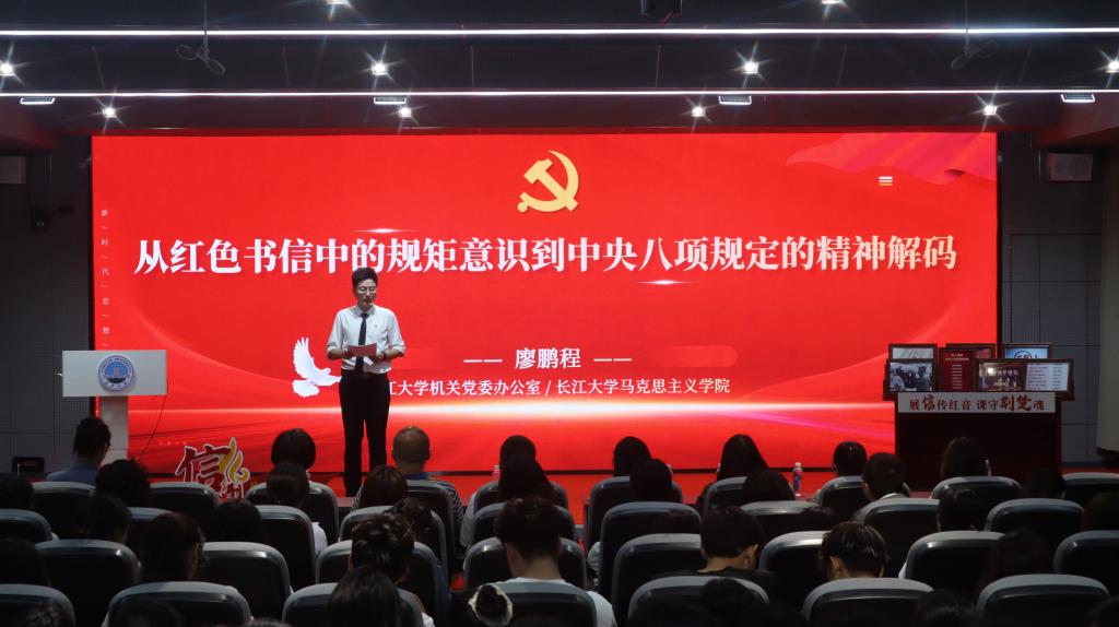 (通讯员文/黎娟 摄/唐佳雨)为进一步推进深入贯彻中央八项规定精神学习教育走深走实,引导青年学子筑牢崇廉尚俭思想根基,培育清正有为时代品格,4月22日晚,《信·荆楚》第二季第六讲《从红色书信中的规矩意识到中央八项规定的精神解码》在东校区16教A313开讲,本次课程由长江大学机关党委办公室主任廖鹏程老师主讲。荆州市委宣传部理论科科长刘立、宣教科科长边飞,马克思主义学院班子成员、《信·荆楚》课程团队,以及湖北省红色书信研究与传播中心的全体教师与同学们一起聆听了这堂“金句不断、燃爆全场”的思政课。